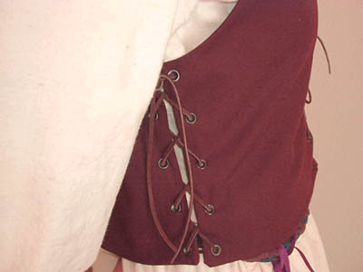 The jerkin is lined and all seams are hidden and nicely finished. Several grommets down the centre offer additional durability (as opposed to button holes which become worn after time) with leather lacing adorning the front. The jerkin falls to the waist (not the hips) and will fit almost anyone (measure from front of shoulder to waist).