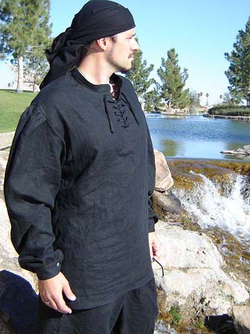 No pirate would be caught dead without their crevatte. The crevatte has a curious and long reaching history as the de facto standard neckware for sailors around the world. It was worn as a basic scarf against cold weather drafts, was used as a handkerchief, and even ended up as a makeshift biggins to ward off the hot sun. We show it wrapping the head to keep all those dirty, lice-infested dreadlocks in place. Measuring 44 x 44 inches, it's an extra large crevatte that can easily be wound into a proper necktie. Worn either way it is indispensible to a pirate and is available in your choice of color in 100% cotton, cotton/polyester and linen.