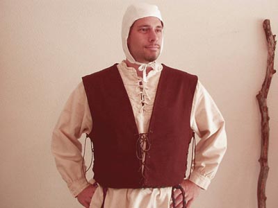 Our short jerkin is made of a durable cotton twill, and is stout enough for the most active adventurer. The jerkin is laced on each side and down the front with leather cording, through durable metal grommets. The jerkin falls to the waist in the back (not the hips) and will fit almost anyone. Taken together we are sure you agree, the effect is both dashing and functional! Please e-mail us with any questions.