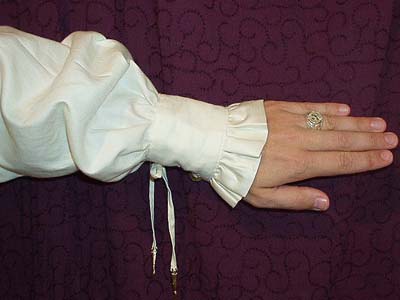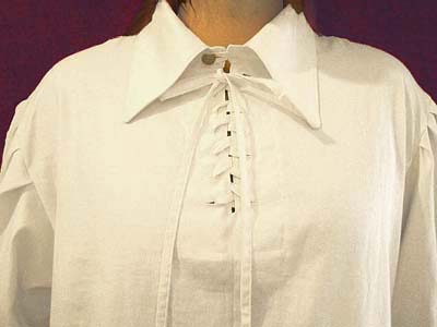 Add the quality of poetic license to your Renaissance garb with M'Lord Geoffrey's 13th-18th C. European Gentleman's Shift (Shirt). This fine shirt is ideal for the noble, the gentryman, the artisan, or the merchant! The smooth and fitted shape of this shirt make it perfect for wearing under doublets. The cuffed sleeves are VERY full for freedom of movement and are laced together through button holes with hand-made ties tipped with etched gold aguillettes, adding that necessary touch of elegance to any noble's ensemble. The full collar features a stand designed for the proper fit over the neckline of your doublet...no more 'lost' collars being pulled into your doublet! A single silver or gold (your choice) button closes the collar.