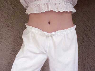 They have an adjustable drawstring waistline with a strong grosgrain ribbon ending in pretty beads (to make it easier to find the ribbon ends) so you will always have a perfect fit. The legs are gently gathered with comfortable wide elastic and are adorned with a beautiful crocheted cluny lace that is both sturdy and feminine. These Low Riders will be your favorite summer wear...don’t miss out!